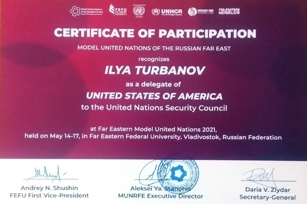 «Участие в конференции стало для нас очень интересным, а также достаточно полезным опытом, который нам, несомненно, хотелось бы вновь повторить. Это связано не только с тем, что мы познакомились с городом и участниками этой конференции, но также и с практикой английского языка, что является, безусловно, необходимым для нашего направления обучения. В ходе шести сессий мы ближе познакомились с работой совета безопасности ООН, а также со вторым комитетом генеральной ассамблеи ООН. Помимо этого, мы обогатили свой словарный запас дипломатической лексикой, что может стать полезным знанием для будущего участия в подобных мероприятиях», – поделился впечатлениями от участия Илья Турбанов.