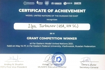 Студенты Комсомольского-на-Амуре государственного университета приняли участие в конференции «Дальневосточная модель ООН 2021 (ДВМООН)» (14-17 мая 2021 года, г. Владивосток). Команду университета представляли студенты кафедры лингвистики и межкультурной коммуникации социально-гуманитарного факультета Ярослава Грачева и Илья Турбанов.