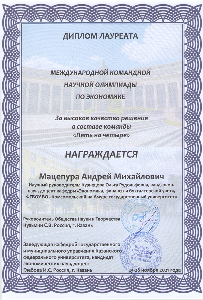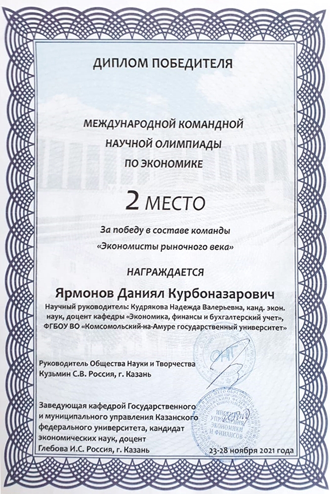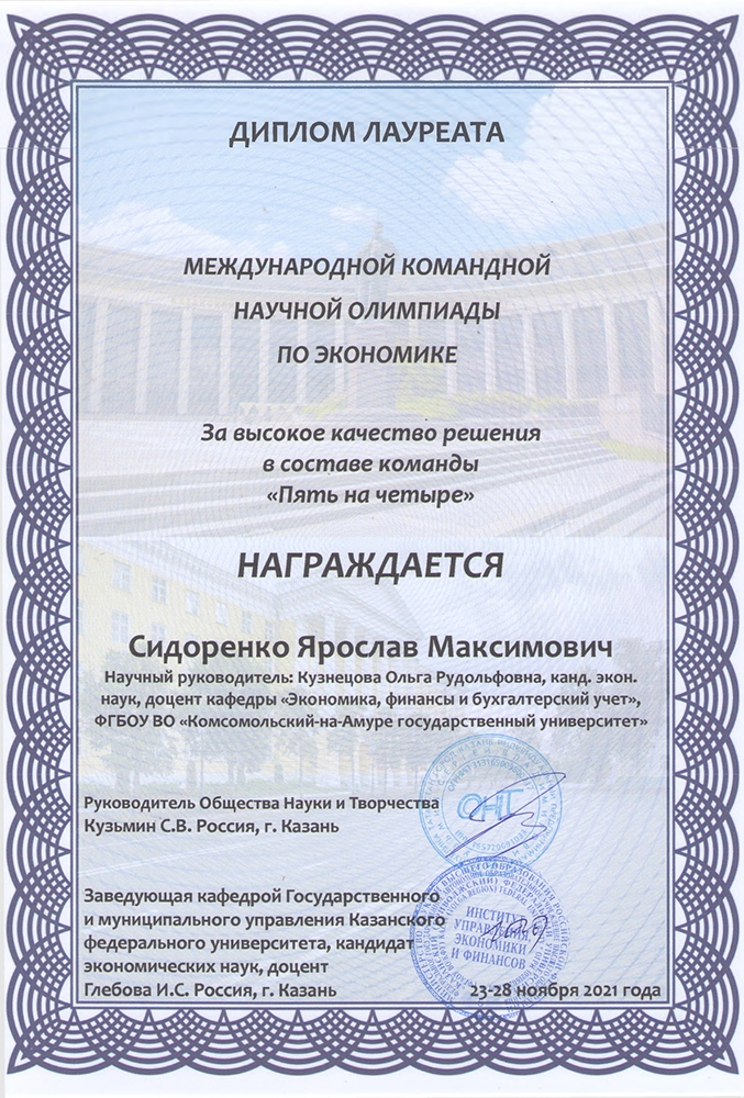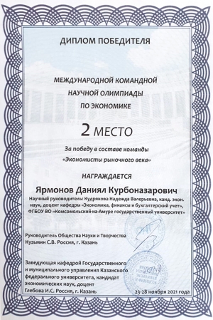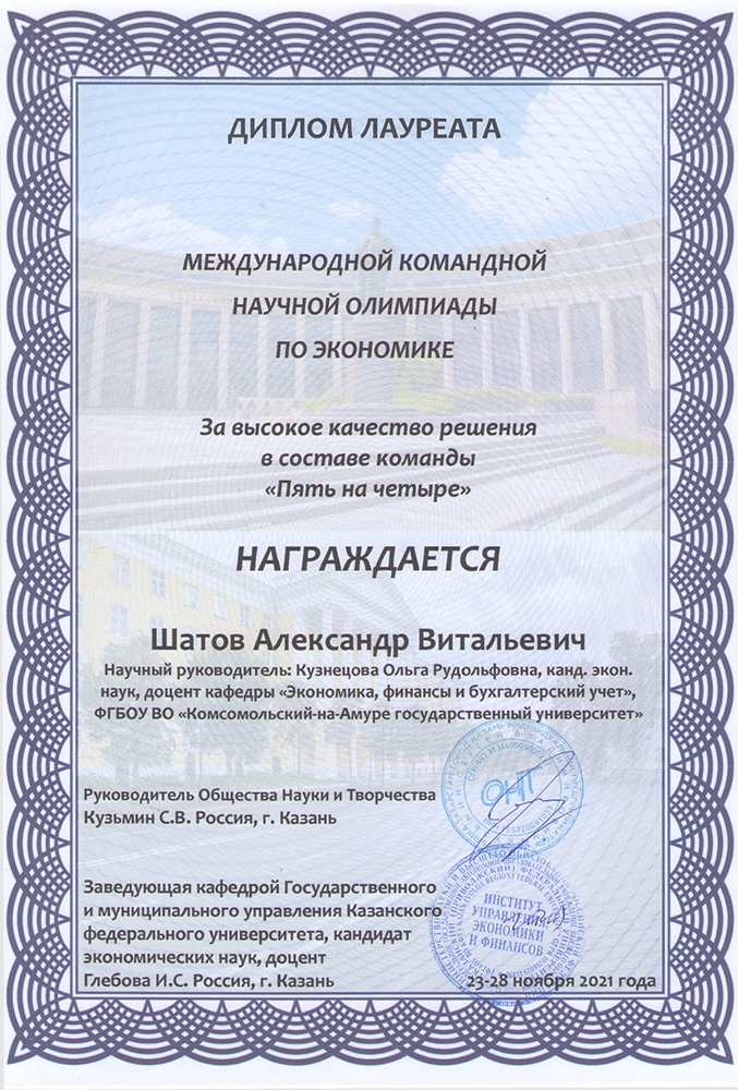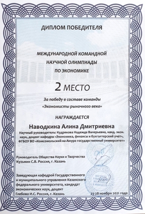 С 22 по 28 ноября 2021 года в г. Казани прошла международная заочная олимпиада по экономике, организаторами которой были Казанский федеральный университет и Общество науки и творчества.