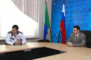 В рамках рабочего визита Комсомольский-на-Амуре государственный университет посетил заместитель министра экономического развития края Д. В. Пугачев. Основной целью визита было вручение почётных грамот от Министерства экономического развития Хабаровского края аспиранткам факультета энергетики и управления кафедры «Управление инновационными процессами и проектами» Вере Соколовой и Алине Пугачевой.