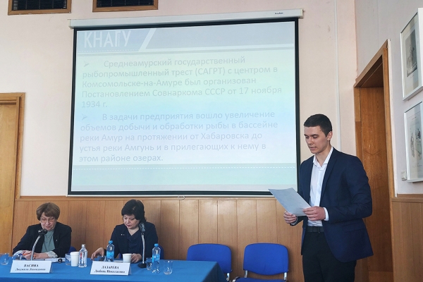 Студент социально-гуманитарного факультета КнАГУ Роман Громов прошёл конкурсный отбор и получил приглашение принять очное участие в конференции с докладом «Влияние военного времени на развитие рыбной отрасли Дальнего Востока на примере Среднеамурского государственного рыбопромышленного треста в 1941 г.» (научный руководитель – доктор исторических наук профессор Ж. В. Петрунина).