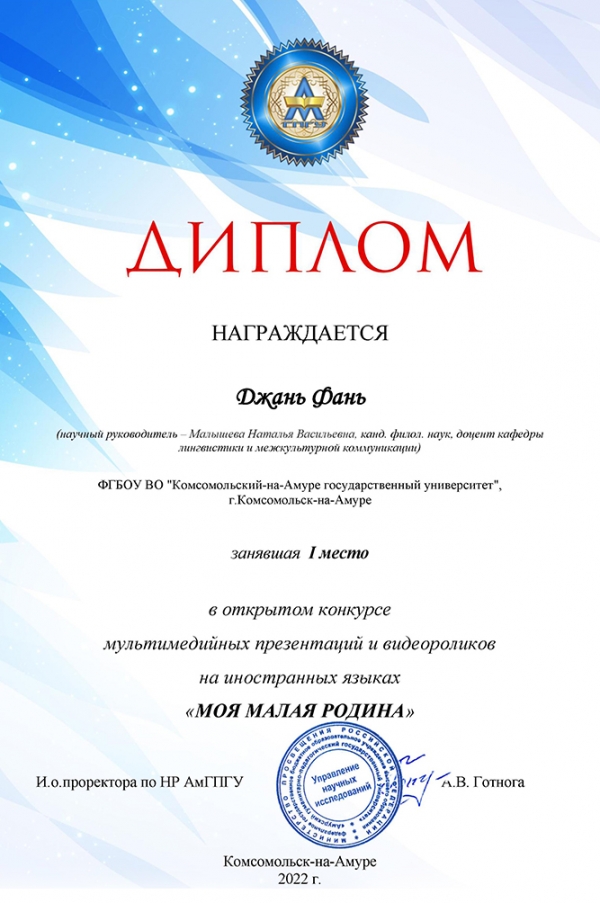 С 18 по 27 апреля 2022 года кафедрой иностранных языков Амурского гуманитарно-педагогического государственного университета проводился открытый конкурс мультимедийных презентаций и видеороликов на иностранных языках «Моя малая Родина».