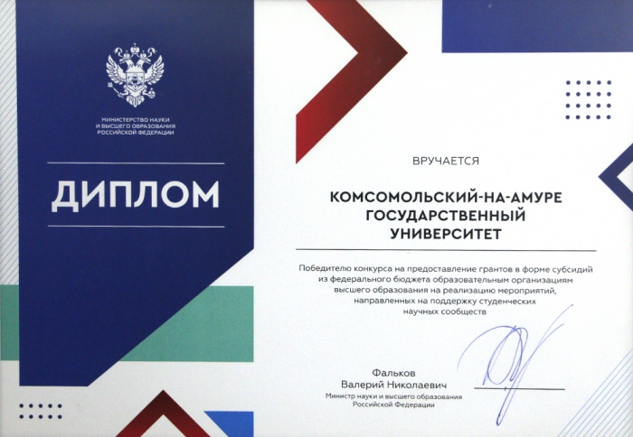 В рамках съезда прошло торжественное награждение победителей конкурса на предоставление грантов в форме субсидий из федерального бюджета образовательным организациям высшего образования на реализацию мероприятий, направленных на поддержку студенческих научных сообществ. Комсомольский-на-Амуре государственный университет был удостоен диплома победителя.