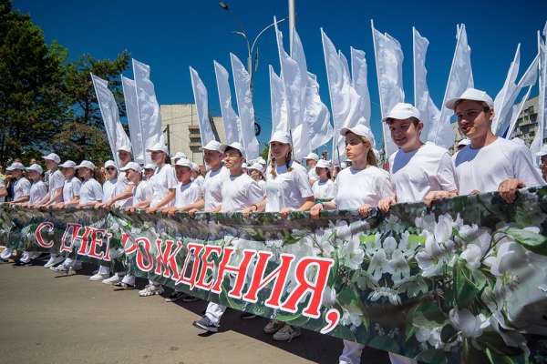 В этом году колонна прошла от площади имени Ленина до Драматического театра, участие в шествии приняли более 16 000 человек. В торжественных мероприятиях приняли участие первые лица региона. Колонну шествия по случаю юбилея возглавил губернатор М. В. Дегтярёв, который обратился к жителям города Юности с приветственным словом: