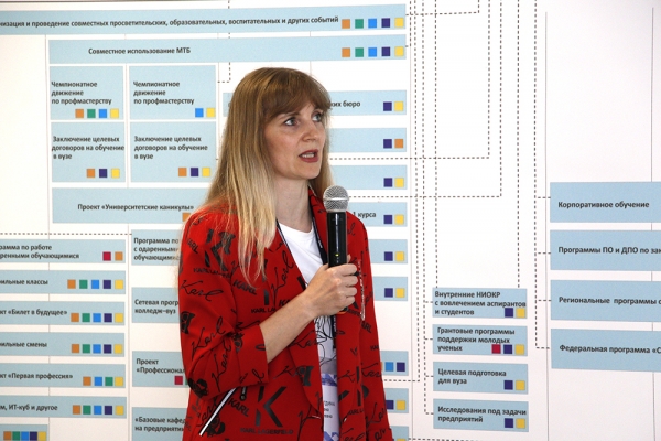 Затем прошла проектная работа в группах по направлениям: профориентационная работа, трудоустройство, образовательные программы, работодатели. По итогам работы состоялась презентация дорожных карт каждой группы по своему направлению. Команды представили комплекс мероприятий по решению проблем подготовки кадров для экономики города и региона.