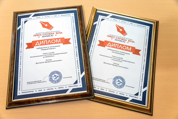 КнАГУ получил диплом победителя VIII Всероссийского конкурса «Пресс-служба вуза» в двух номинациях: «МедиаСтратег» и «ИнтерГрация». Комиссия высоко оценила уникальность, качество и регулярность публикуемых на информационных ресурсах КнАГУ материалов, посвящённых стратегическому развитию вуза и международной деятельности.