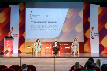 Также состоялся открытый разговор о Премии Президента РФ в области науки и инноваций для молодых учёных. Представитель Координационного совета Надежда Чубова и лауреаты Премии Президента Российской Федерации в области науки и инноваций для молодых учёных Екатерина Шишацкая и Павел Белов рассказали о нюансах подачи заявок на соискание Премии Президента РФ, поделились историями успехов и ответили на вопросы участников встречи.