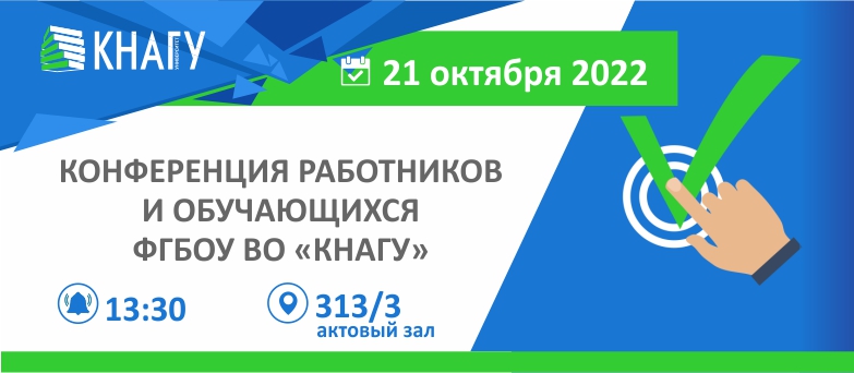 21 октября 2022 года в актовом зале университета (ауд. 313/3) состоится конференция работников и обучающихся ФГБОУ ВО «КнАГУ».