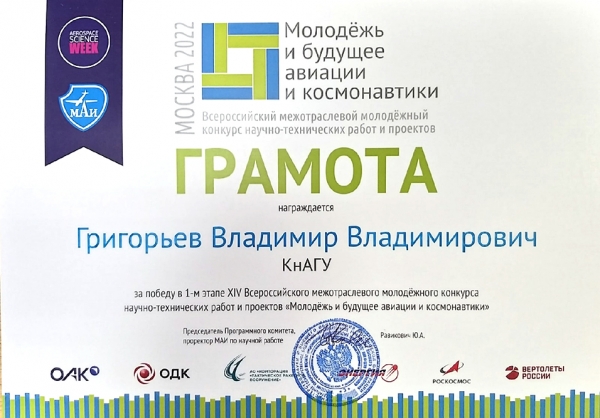 Конкурсная комиссия, сформированная из представителей Московского авиационного института (национального исследовательского университета) и ведущих корпораций авиакосмической отрасли высоко оценила проект В. В. Григорьева и А. В. Солнцевой. Авторский коллектив получил диплом авторов лучшей работы от объединённой авиастроительной корпорации.