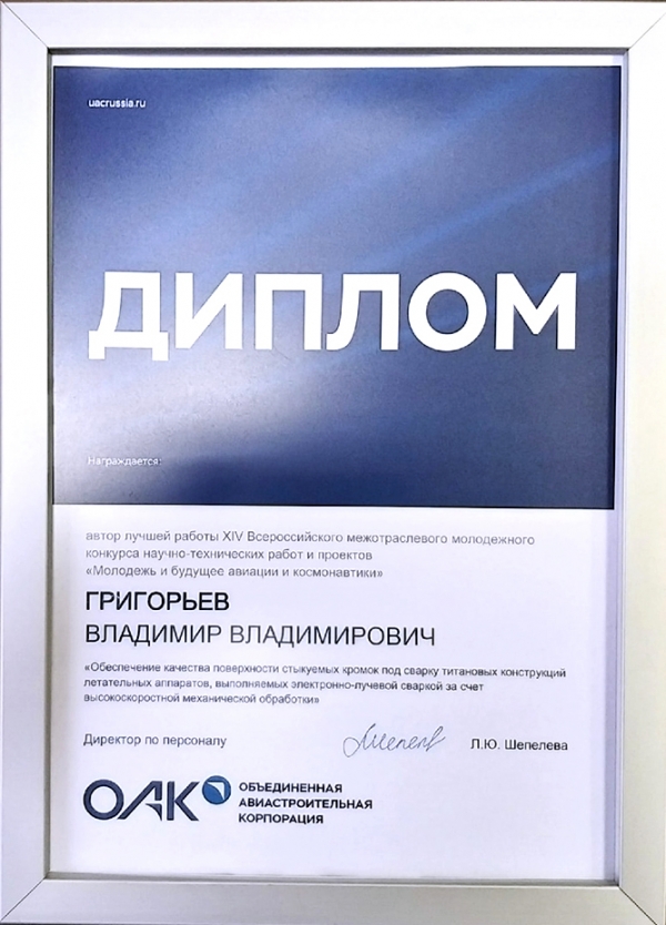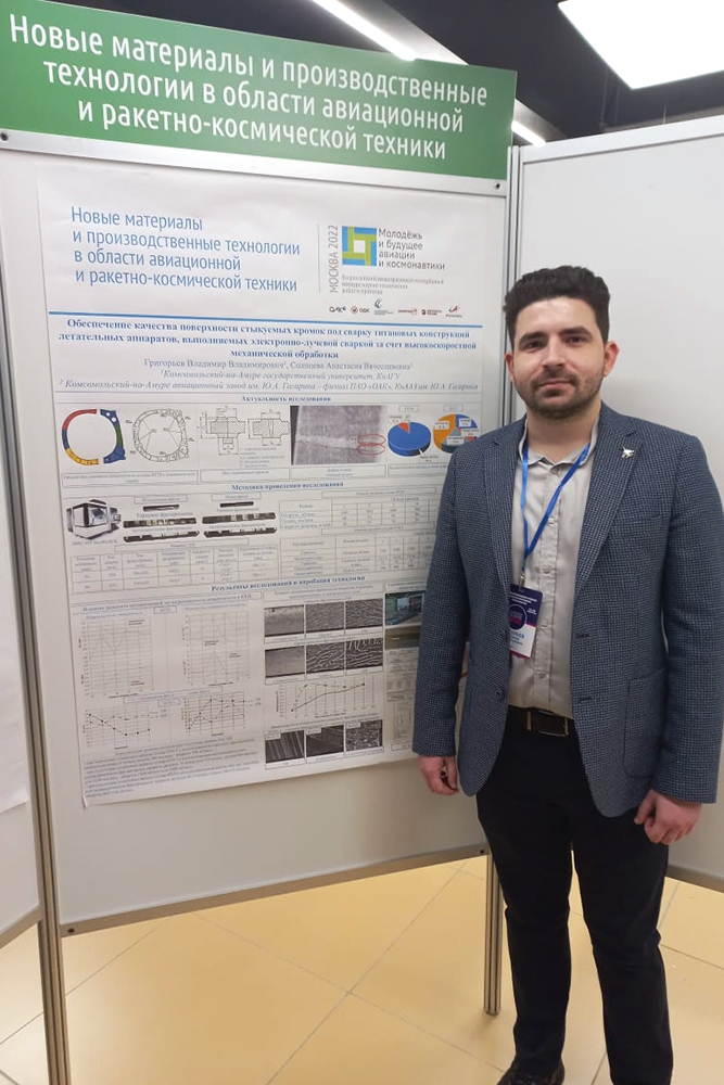 Владимир Владимирович совместно Анастасией Вячеславовной в финале конкурса «Молодёжь и будущее авиации и космонавтики» представили проект в секции «Новые материалы и производственные технологии в области авиационной и ракетно-космической техники» на тему «Обеспечение качества поверхности стыкуемых кромок под сварку титановых конструкций летательных аппаратов, выполняемых электронно-лучевой сваркой за счёт высокоскоростной механической обработки», научный руководитель Павел Вячеславович Бахматов.
