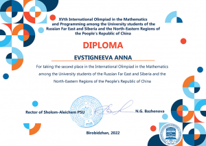 26 ноября 2022 года студенты факультета компьютерных технологий Комсомольского-на-Амуре государственного университета приняли участие и стали призёрами 15-й Международной олимпиады по математике и программированию среди студентов вузов Дальнего Востока, Сибири и Северо-Восточных регионов Китайской Народной Республики.