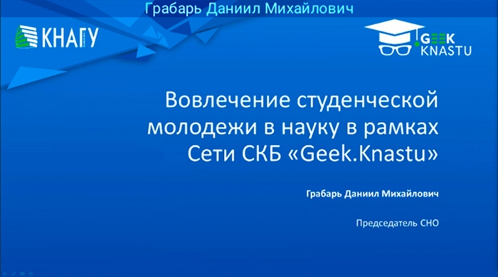 От нашего университета в секции «Вовлечение молодёжи в науку» с докладом на тему «Вовлечение студенческой молодёжи в науку в рамках Сети СКБ “Geek.Knastu”» в онлайн-формате выступил Грабарь Даниил, председатель студенческого научного сообщества КнАГУ «Сеть студенческих конструкторских бюро Geek.Knastu». Даниил рассказал о деятельности сети СКБ за последний год, каких высоких результатов добилась сеть за счёт выигранных грантов: гранта на реализацию мероприятий, направленных на поддержку студенческих научных сообществ от Министерства науки и высшего образования РФ (3 млн рублей) и гранта от Федерального агентства по делам молодёжи (Росмолодёжь) на реализацию Молодёжного фестиваля технического творчества «ТехноФест-2022» (4,7 млн рублей).