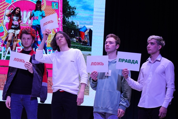 Далее участники проявили себя в интеллектуальном конкурсе, где нужно было угадать ложность и истинность высказываний. Зал едва ли мог сдержать удивление, ведь вопросы были довольно необычными. Оказалось, что ДНК человека и банана совпадает на 50 %, а перевод слова «алиби» фразой «это был не я» оказался неверным.