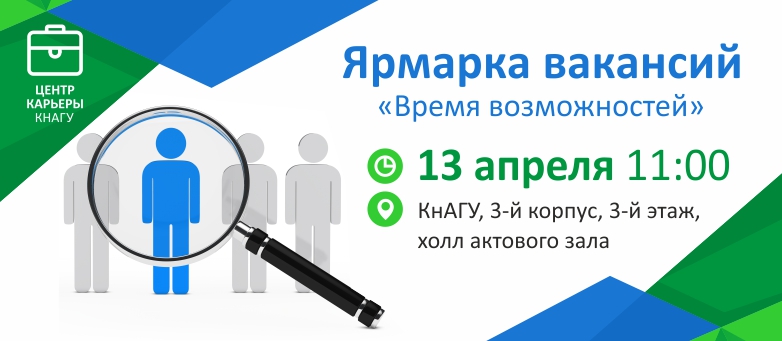 Центр карьеры КнАГУ приглашает посетить Ярмарку вакансий «Время возможностей», которая проводится в рамках Всероссийского марафона карьеры в промышленности.