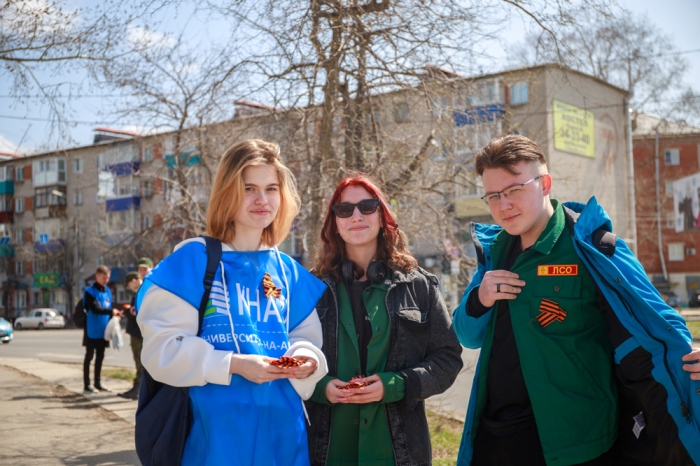 Так, 5 мая волонтёры и активисты КнАГУ присоединились к Всероссийской акции «Георгиевская ленточка – 2023». Акция проводилась при содействии отдела организации воспитательной работы университета. Традиционно на площади имени Володарского студенческий актив университета раздал жителям города Юности более 150 георгиевских ленточек в знак памяти о героях Великой Отечественной войны. Участниками мероприятия стали люди пожилого возраста, подростки и молодёжь нашего города.