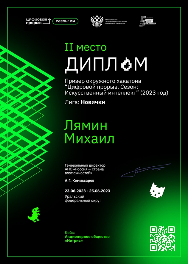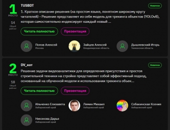 Лямин Михаил: Очень интересный хакатон, организация была на высоком уровне. За три дня было три чекпойнта, где нам подсказывали, в правильном ли мы направлении движемся и что ещё необходимо сделать для победы. В хакатоне такой направленности мы с командой участвовали впервые. Нам предстояло решить кейс-задание, в рамках которого нужно было создать искусственный интеллект для распознавания строительной техники на строительном объекте. Попробовать свои силы и ещё выйти в призовые места – было очень круто! Пара бессонных ночей дала результат, у нас получилось показать, на что мы способны в этой сфере.