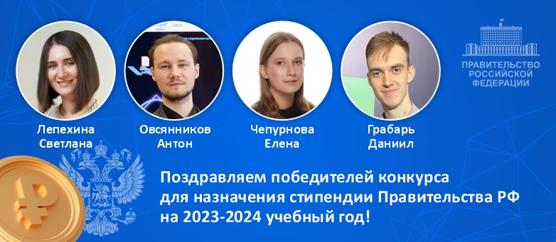 В соответствии с приказом Министерства науки и высшего образования Российской Федерации от 31 августа 2023 г. № 833 «О назначении стипендий Правительства Российской Федерации студентам, обучающимся по очной форме по образовательным программам высшего образования в государственных организациях, осуществляющих образовательную деятельность по образовательным программам высшего образования, находящихся в ведении Министерства науки и высшего образования Российской Федерации, и в государственных организациях, осуществляющих образовательную деятельность по образовательным программам высшего образования, функции и полномочия учредителя в отношении которых осуществляет Правительство Российской Федерации, на 2023/24 учебный год» победителями стали:
