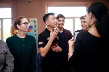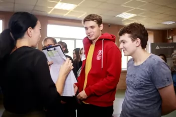 Следующим упражнением стало приветствие, однако оно было необычным: нужно было разбиться на пары, и поздороваться с напарником так, словно это близкий друг, с которым не виделись длительное время, и сегодня неожиданно состоялась встреча. Студенты с удовольствием знакомились, пожимали друг другу руки, говорили тёплые слова, шутили. Упражнение зарядило ребят позитивом.