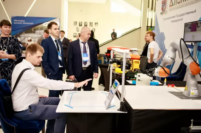 - Коллаборативный роботизированный комплекс c интеллектуальной системой жестового управления. Комплекс создан на базе коллаборативного робота и самостоятельно разработанной интеллектуальной системы управления. Система осуществляет распознавание руки человека в пространстве, определение её координат, факта сжатия/разжатия кисти. Далее распознанные данные преобразуются в команды для робота, в соответствии с которыми он перемещает в пространстве захват и повторяет действия человека (разработан комплекс на факультете энергетики и управления в научно-образовательном центре «Промышленная робототехника и передовые промышленные технологии», автор проекта – С. И. Сухоруков).