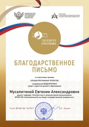 05-15 октября 2023 года в ФГБОУ ВО «АМГПГУ» был проведён Всероссийский конкурс творческих работ и мультимедийных средств обучения на иностранных языках «Профессия учитель». На конкурс было представлено более 200 работ из учебных заведений разных регионов России.