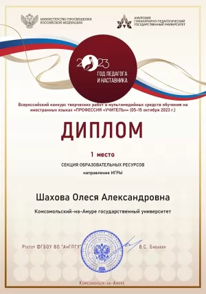 1-е место в секции «Образовательные ресурсы (направление – игры)» – Шахова Олеся, гр. 0БЛб-1 (руководитель Н. В. Малышева, кандидат филологических наук, доцент кафедры лингвистики и межкультурной коммуникации КнАГУ).