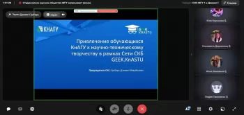Ещё одно достижение в копилку СНС «Сеть СКБ Geek.Knastu» – победа во Всероссийском конкурсе лучших практик студенческих научных обществ и популяризации науки «PRO-СНО» в номинации «Практики организации научных кружков, СКБ» (авторы проекта – Екатерина Михайловна Димитриади, начальник отдела ОНиПКРС, руководитель Сети СКБ Geek.Knastu, Анна Валинуровна Ахметова, начальник УНИД, куратор Сети СКБ Geek.Knastu, Даниил Михайлович Грабарь, студент ФЭУ, председатель СНС «Сеть СКБ Geek.Knastu»). Защиту проекта в онлайн-формате провела Екатерина Михайловна Димитриади. Целями конкурса стали создание условий для распространения позитивного опыта деятельности студенческих научных сообществ и других молодёжных научных объединений, расширение научных, информационных, организационно-методических связей между ними. Конкурс объединил представителей СНО со всей страны и Ближнего зарубежья.