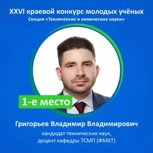 1-е место – Владимир Владимирович Григорьев, кандидат технических наук, доцент кафедры ТСМП (ФМХТ); научный руководитель – кандидат технических наук доцент Павел Вячеславович Бахматов.
