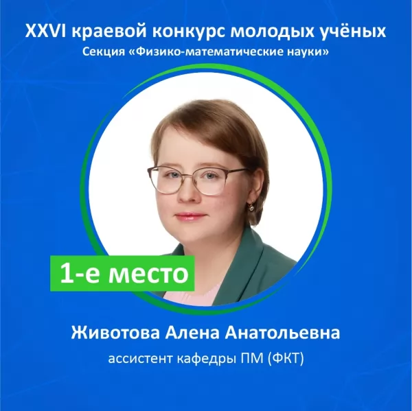 1-е место – Алена Анатольевна Животова, ассистент кафедры ПМ (ФКТ); научный руководитель – кандидат технических наук доцент Виктор Дмитриевич Бердоносов.