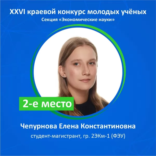 2-е место – Елена Константиновна Чепурнова, студент-магистрант, гр. 2ЭКм-1 (ФЭУ); научные руководители: кандидат технических наук доцент Иван Константинович Андрианов, кандидат экономических наук доцент Ольга Рудольфовна Кузнецова.