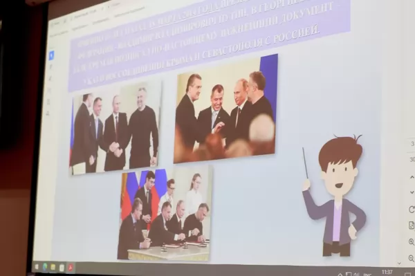 Модератором встречи выступила зав. кафедрой «История и культурология» доктор исторических наук профессор Жанна Валерьяновна Петрунина. Она напомнила о событиях «крымской весны» 2014 года, рассказала немного об истории этого уникального субъекта РФ, предложила студентам стать участниками викторины на знание истории, географии, геральдики полуострова.