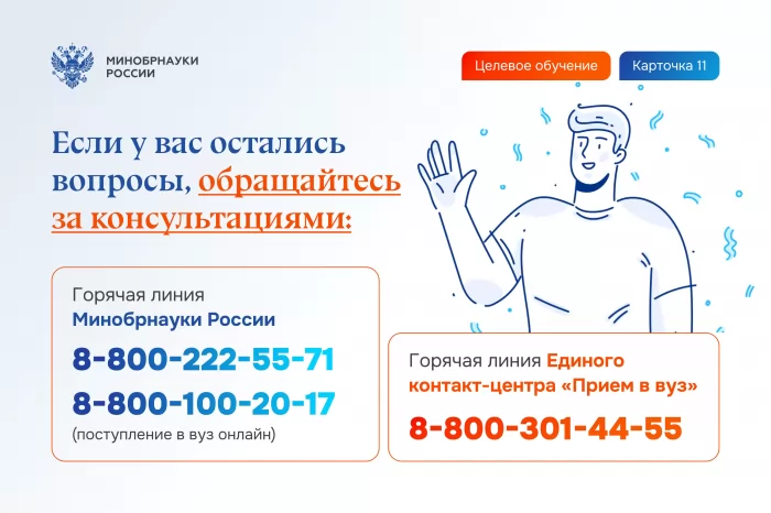 - Горячая линия Минобрнауки России: 8-800-222-55-71, 8-800-100-20-17 (поступление в вуз онлайн).
