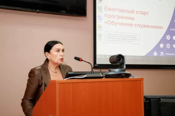 Презентацию программы для участников старта провела и. о. ректора, проректор по воспитательной работе и работе с молодёжью Татьяна Евгеньевна Наливайко. Спикер рассказала об основной миссии программы, её цели, разъяснила содержание и современное значение и смысл «служения», познакомила с методическими материалами и ресурсом добро.рф, где расположен сервис «Обучение служением».