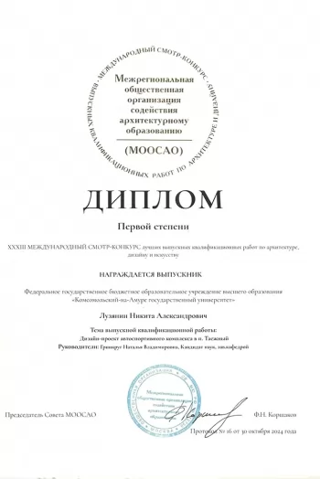 - диплом первой степени – Никита Лузянин, ВКР «Дизайн-проект автоспортивного комплекса в п. Таёжный» (руководитель Н. В. Гринкруг);