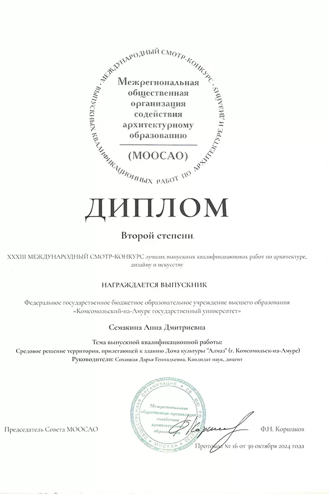 - диплом второй степени – Анна Семакина, ВКР «Средовое решение территории, прилегающей к зданию Дома культуры “Алмаз” (г. Комсомольск-на-Амуре)» (руководитель Д. Г. Сохацкая);
