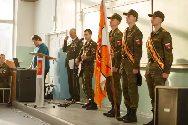 Мероприятие началось с исполнения Гимна Российской Федерации и выноса знамени Военного учебного центра.