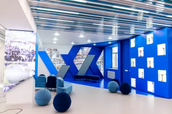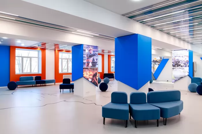 Процессом создания дизайн-проекта обновлённых пространств поделилась автор – студентка факультета кадастра и строительства Яна Шевченко: «Создание интерьера – интересный и трудоёмкий процесс работы. При создании правильного наполнения пространства интерьера необходимо выделить стиль, провести анализ и найти точки касания его философии, чтобы он понравился заказчику и людям, которые будут пользоваться спроектированным пространством. В основную идею дизайн-проекта легла история города Комсомольска-на-Амуре и его градообразующих предприятий, которая отображается в полотнах световых элементов. В цветовой карте интерьера используются фирменные цвета ОАК “Яковлев”. Основные элементы в интерьере – геометрические фигуры, напоминающие полёт и движение самолёта. Чёткость геометрии интерьера смягчается плавными формами мягкой мебели. Создавать интерьер для нашего университета было интересно, без небольших рабочих трудностей во время реализации не обошлось, но они незначительны на фоне общей выполненной работы. Очень приятно осознавать, что есть пространство, радующее студентов и преподавателей. Дизайн-проект создавался под руководством Дарьи Геннадьевны Сохацкой, я благодарна ей за поддержку и работу по реализации данного интерьера. Дарья Геннадьевна от начала и до конца работала в команде, мы вместе сталкивались с трудностями и совместно их решали!»