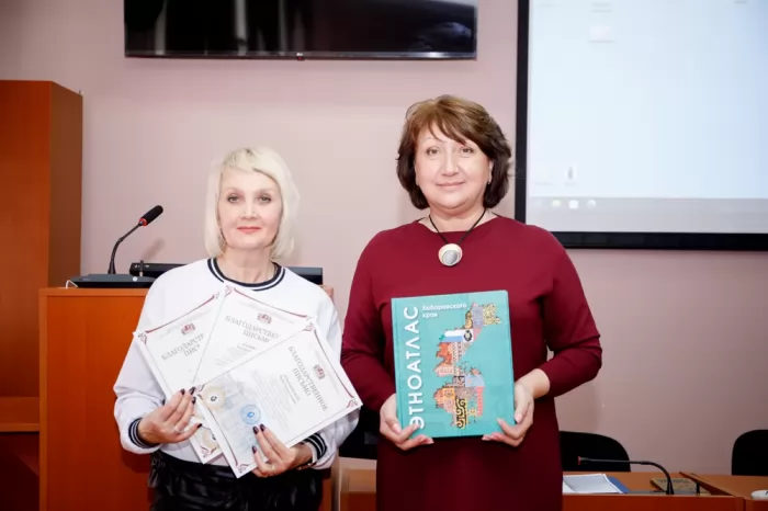 Представители ДВГНБ выразили благодарность руководству нашего университета за помощь в организации площадки фестиваля. В дар научно-технической библиотеке было передано уникальное иллюстрированное издание «Этноатлас Хабаровского края», в котором раскрыта картина культурного многообразия всех народов, проживающих на территории края. Этноатлас будет полезен всем, кто интересуется краеведением, историей, этнологией Хабаровского края.