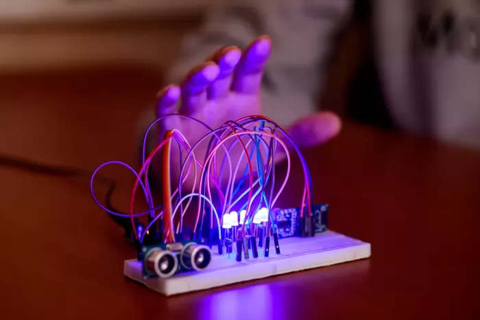 Дилшоджон: Ультразвуковые сенсоры в проекте позволяют фиксировать приближение человека и определять расстояние до него, что открывает возможность для более гибкого управления освещением. Это было трудоёмким процессом, так как мне пришлось потратить много времени на разработку программного обеспечения и отладку макета системы.