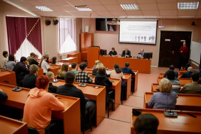 Лектор общества «Знание» Орнацкая Татьяна Александровна представила презентацию «Сила в единстве: консолидация народа как ключевой фактор победы в Великой Отечественной войне», рассказала об истории слова «пропаганда», как и через какие формы велась пропаганда начиная с Первой мировой войны. Спикер побеседовала со студентами и узнала их мнение о необходимости пропаганды национальных ценностей в настоящее время. Участники дискуссии сошлись во мнении, что сейчас слово «пропаганда» имеет негативный окрас, лучше использовать слово «просвещение».