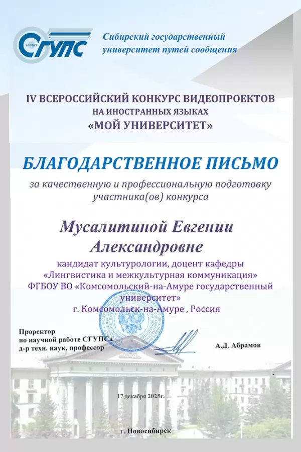 В ноябре 2025 г. Сибирским государственным университетом путей сообщения (СГУПС) проводился Всероссийский Конкурс видеопроектов на иностранных языках. Целью конкурса было развитие иноязычной компетенции, творческих способностей и студенческого сотрудничества в образовательном пространстве России. Участниками стали студенты высших и средних профессиональных учебных заведений со всей страны, изучающие иностранные языки.