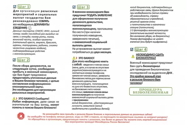 Министерством обороны Российской Федерации, в целях соблюдения прав и реализации социальных гарантий граждан Российской Федерации, снижения роста социальной напряжённости, вызванной отсутствием информации о судьбе пропавших без вести военнослужащих, продолжается выполнение комплекса мероприятий по организации розыска и установлению личности военнослужащих в случае их гибели или пропажи без вести в период проведения специальной военной операции.